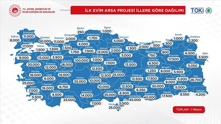 Çevre, Şehircilik ve İklim Değişikliği Bakanı Murat Kurum, Bakanlık ve TOKİ eliyle hayata geçirilen Cumhuriyet tarihinin en büyük sosyal konut hamlesi “İlk Evim, İlk İş Yerim” projesinde yer alan 1 milyon konut arsası kura çekimlerinin 1 Şubat 2023 Çarşamba günü başlayacağını duyurdu. Bakan Kurum, resmî sosyal medya hesabından yaptığı paylaşımda, “İlk Evim projemizle 85 günde 71 ilimizde 182 bin 599 yuvamızın sahibini belirledik. Şimdi sırada arsalarımız var. Altyapısı hazır 1 milyon arsamızın kuralarını çekmeye yarın başlıyoruz. Hayırlı olsun.” ifadelerini kullandı. “İlk Evim Arsa” 1’nci etap kuraları 1-6 Şubat 2023 tarihleri arasında 13 ilde noter huzurunda gerçekleştirilecek.